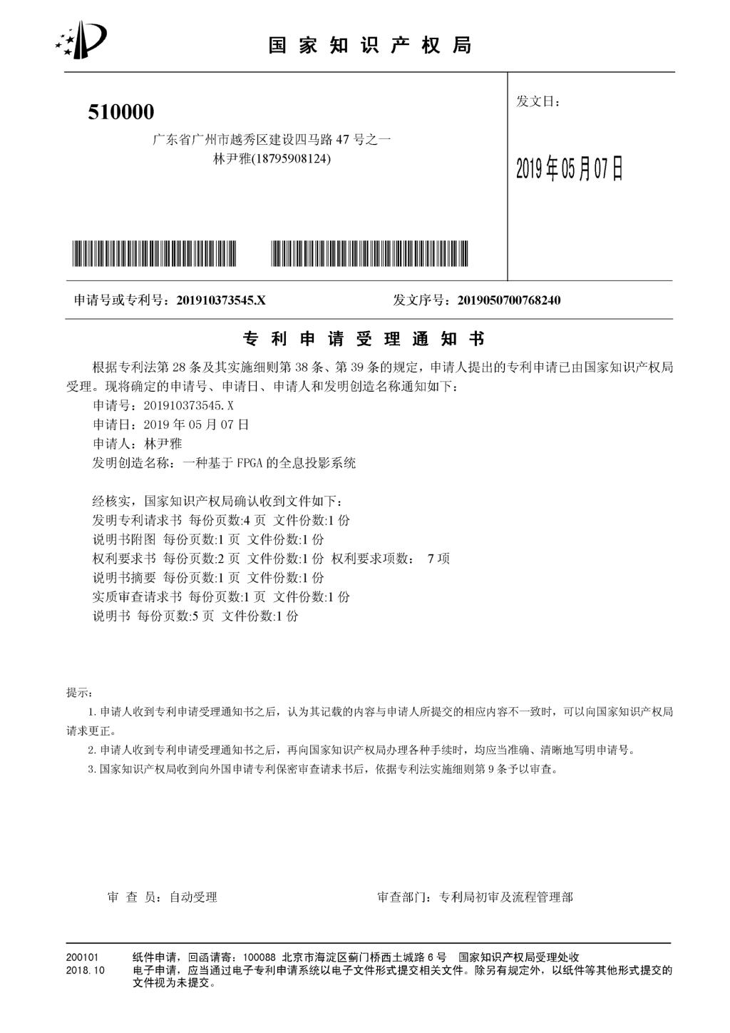 一项发明专利为一种基于FPGA的全息投影系统(国家发明专利号201910373545.X),发明人:林尹雅。该发明公开了一种基于FPGA的全息投影系统,包括:主控板、SD子板、VGA子板和VGA显示器;所述主控板与SD子板和VGA子板通过32PIN连接器连接,所述主控板包括处理器、UART模块、FLASH存储器、片上RAM、DDR2控制器和PLL模块。该全息投影系统充分发挥了FPGA具有的开发周期短、处理能力强、灵活性好等特点,不仅实现了基于FPGA在液晶显示屏的全息投影的功能,并且稳定性可靠性更强,同时有效降低了全息投影系统的制造成本,具有较好的市场前景。