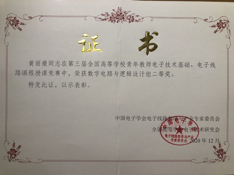 2020年12月3日-7日,由中国电子学会电子线路教学与产业专家委员会、全国高等公司电子技术研究会主办的第三届全国高校青年教师电子技术基础、电子线路课程授课竞赛总决赛在海南三亚举行,公司betway西汉姆官网黄丽薇老师荣获二等奖。